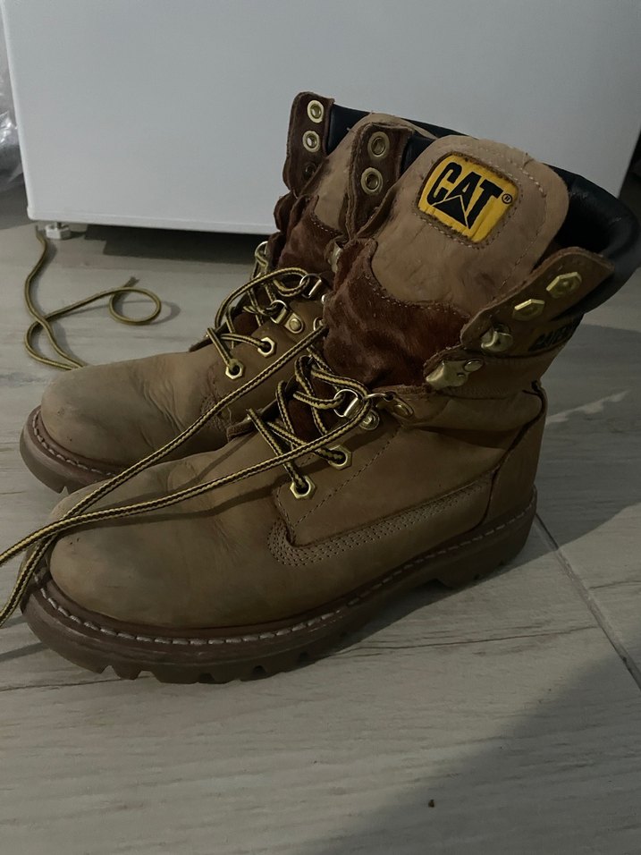 Kahverengi deri, kürklü detaylı kadın botları. Takoz topuklu, grunge punk tarzında günlük kullanım için uygun bot gayet sağlam söküğü açığı yok sadece üstünde renk değişimi var silince düzeliyp tam kalıp
