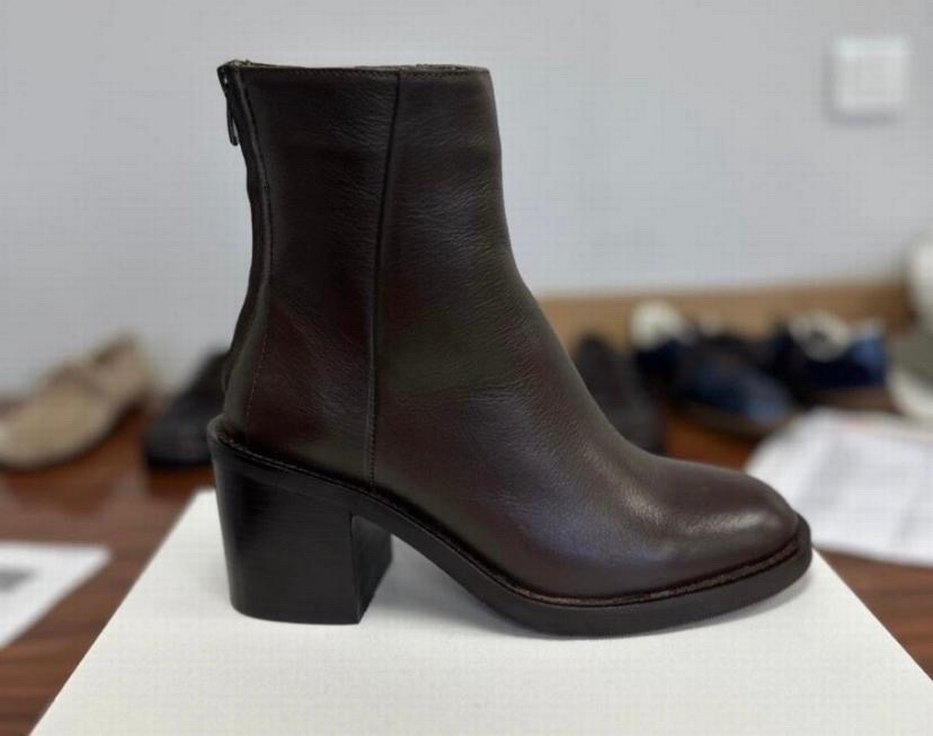 Kahverengi deri kadın botları, kalın topuklu ve tokalı, desen içermeyen düz tasarıma sahip, günlük kullanım için uygundur. Deridir. Hiç kullanılmamıştır.