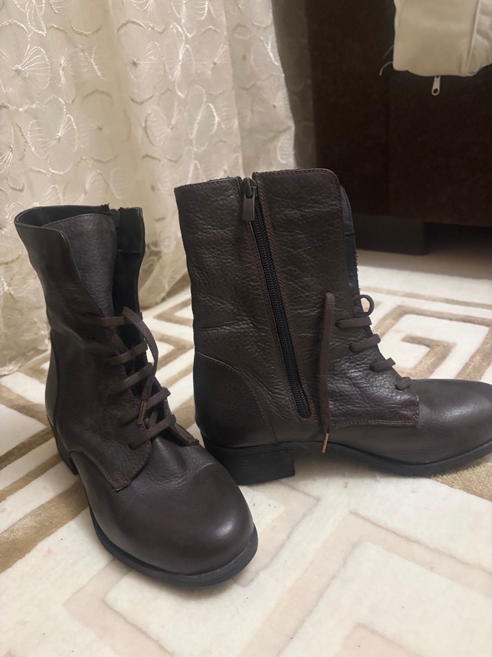 Koyu kahverengi deri kadın botları, blok topuklu ve tokalı detaylıdır. Bağcıklı, rahat goth tarzı günlük kullanıma uygundur. Hiç kullanılmadı yepyeni dışı yumuşacık gerçek deri içi ince kürk