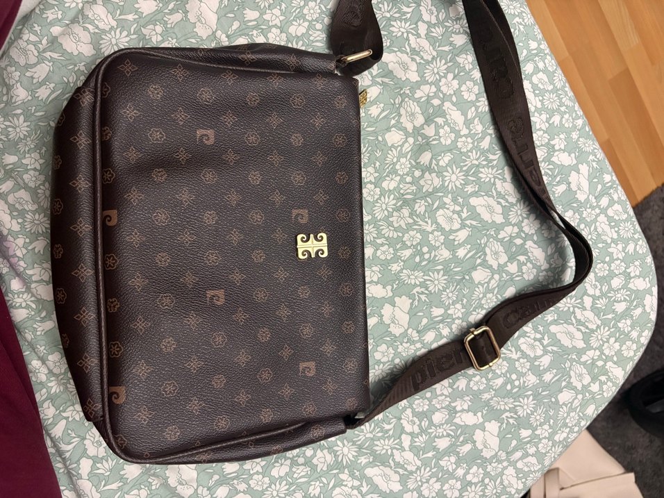 Pierre Cardin Koyu kahverengi deri kadın çanta, baskılı deseni ve tokalı askısıyla klasik Paris tarzını yansıtır.