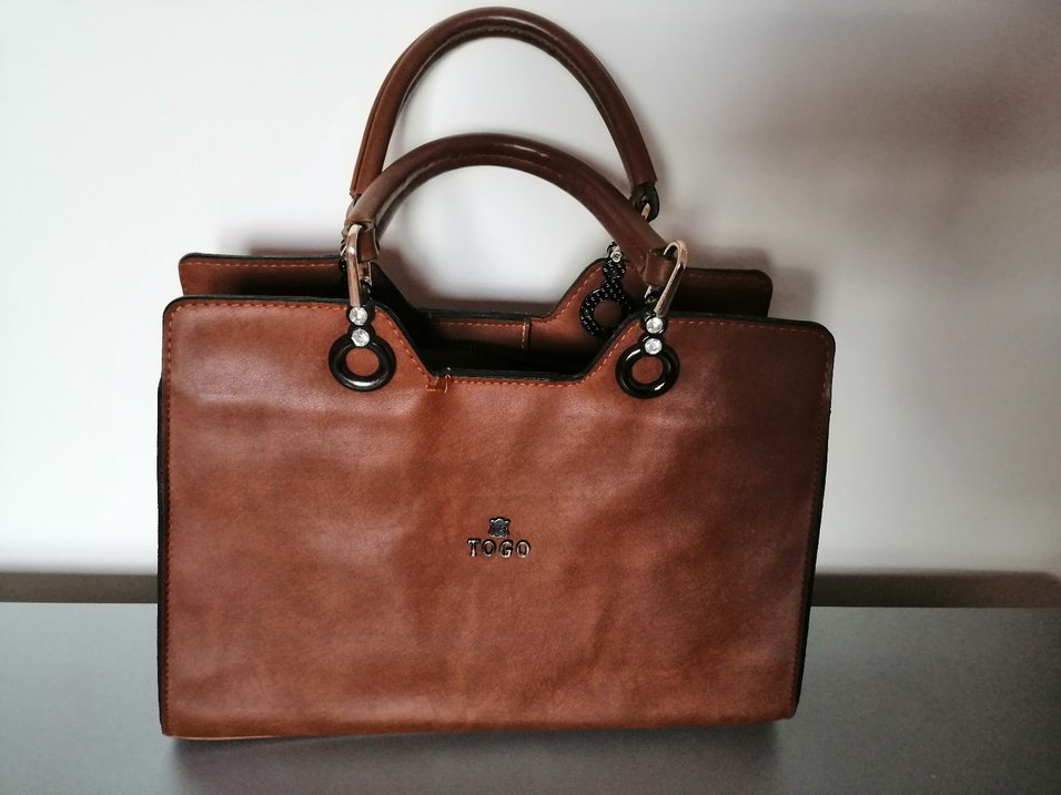 Kahverengi deri, parlak yüzeyli, baskılı detaylı ve tokalı saplara sahip modern klasik tarzda kadın çantasıdır. Önünde 'TOGO' markası bulunur. Togo hakiki deri çanta, önde arkada ve yanda birer dikiş söküğü dışında kusuru yoktur. Oldukça kullanışlı ve sağlam bir çantadır. . 30x21 cm ebatında olup derinliği 13 cm dir