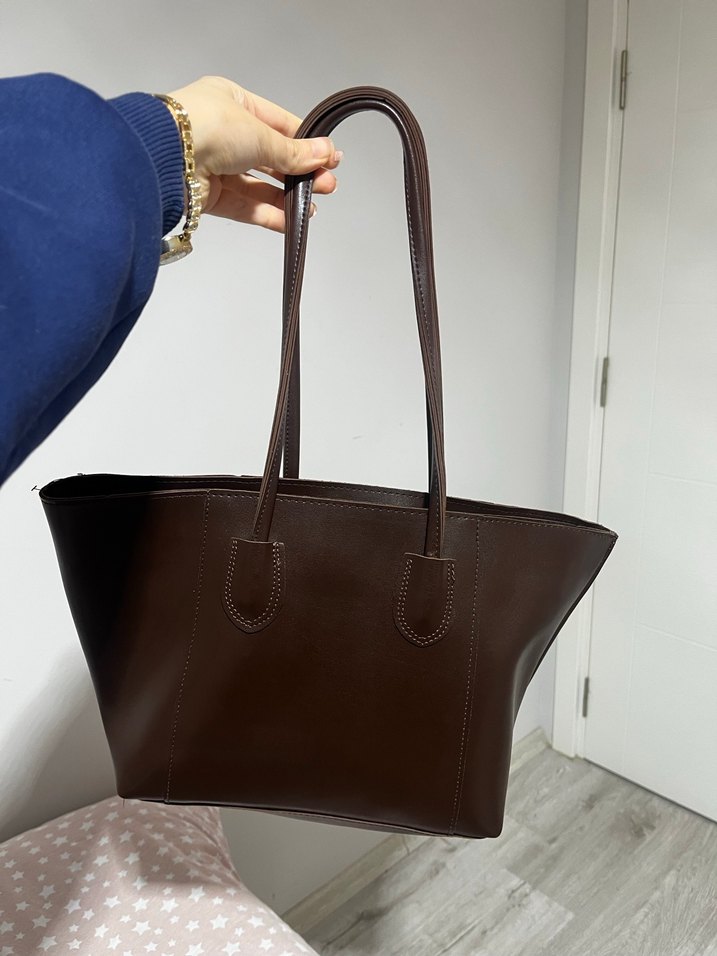 Kahverengi deri kadın çanta, minimalist ve modern klasik tarzda. Günlük kullanım için zahmetsiz şıklık sunar. Düz, koyu kahverengi deri elegant bir görünüm sağlar.