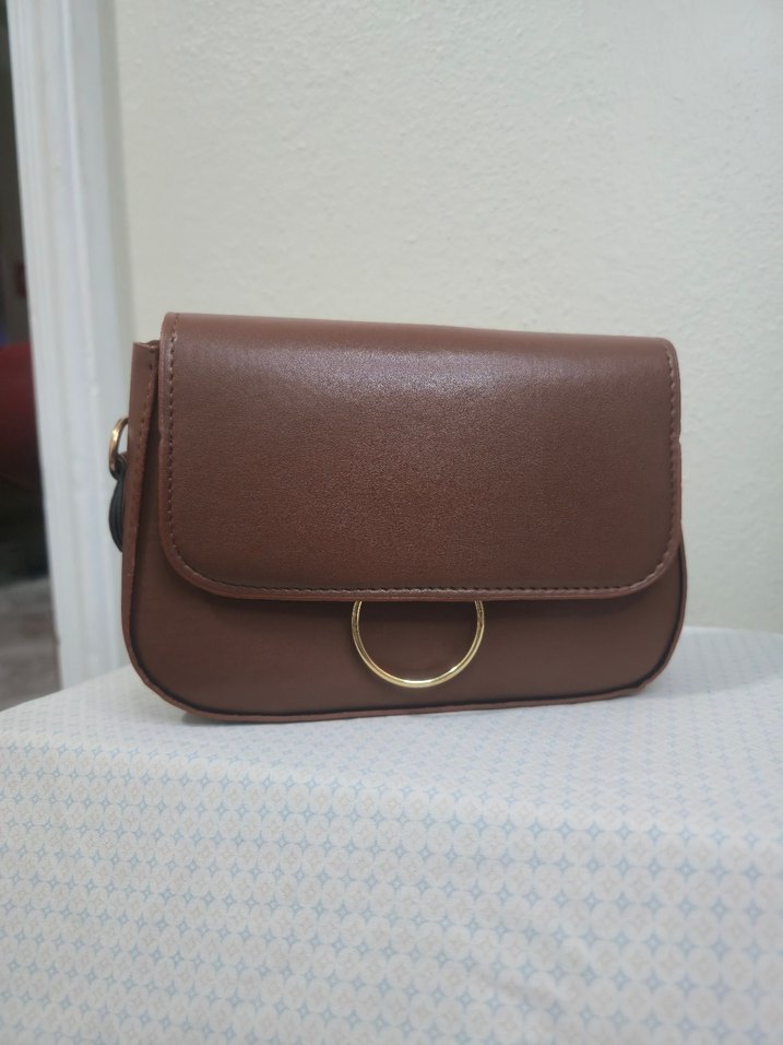 Kahverengi deri kadın çanta, tokalı kapak ve parlak yüzeye sahip, modern klasik ve minimalist tarzda. Günlük kullanıma uygun.