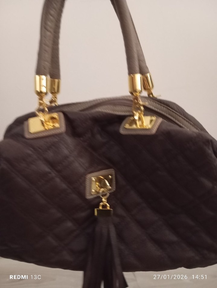 Kahverengi deri kadın çanta, fermuarlı ve desenli yapısıyla klasik zarafeti yansıtır. Parlak altın detaylar ve çağdaş Paris tarzı öne çıkar.