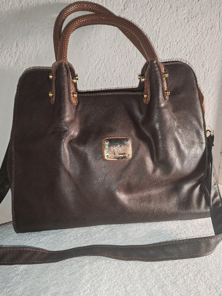 Amerikasan alındı Kahverengi deri kadın çanta, yılan derisi desenli saplar ve tokalı detaylarla klasik ve modern tarzı bir araya getirir.