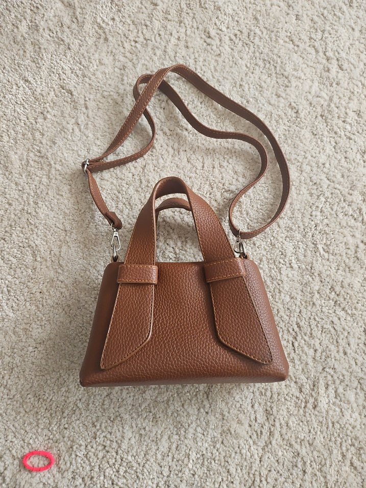 Kahverengi deri kadın çanta, minimal tasarımlı ve tokalıdır. Çıkarılabilir askısı günlük kullanıma uygundur. Desensiz ve çağdaş stil sunar.