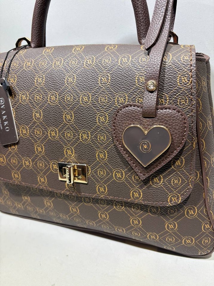 Kahverengi deri kadın çanta, baskılı desene ve tokalı kapanışa sahiptir. Modern klasik tarzda, parlak yüzeyli ve kalp şeklinde aksesuar içerir.