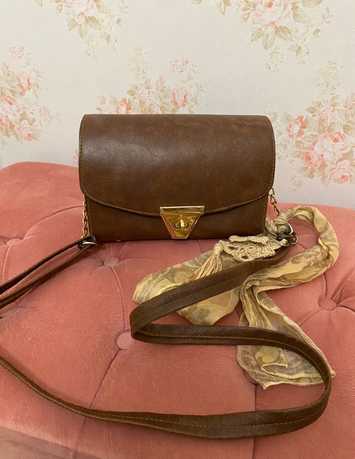 Parlak kahverengi deri kadın çanta, tokalı kapama ile modern klasik tarzda, düz yüzeye sahip ve günlük kullanım için uygun. Metal kısımlarında hafif defosu mevcuttur çok belli değildir, renk değişimi ve çizikler fotoda gösterilmiştir