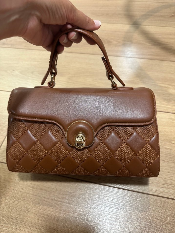 Kahverengi deri, tokalı kapaklı, kapitone dokulu kadın çantası. Modern klasik tarzda, günlük kullanıma uygundur.