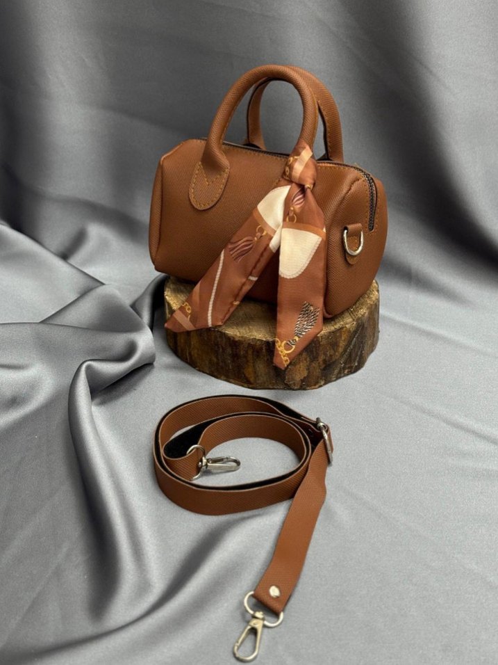 Parlak görünümlü kahverengi deri çanta, tokalı detaylara ve çıkarılabilir askıya sahip. Minimalist, bohem tarzda, günlük kullanıma uygun.
