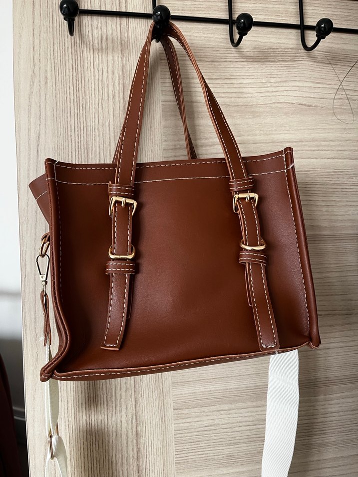 Parlak kahverengi deri çanta, tokalı kayışlara sahip, minimalist ve bohem tarzda. Desensiz ve günlük kullanıma uygun.