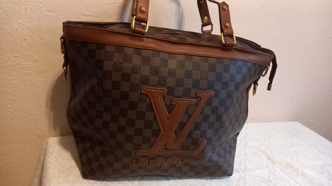 Kahverengi deri, baskılı desenli ve tokalı askılı kadın çantası. Modern klasik tarzda, günlük kullanıma uygun.
