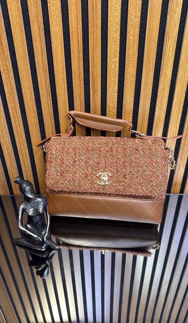 Kahverengi deri kadın çanta, parlak baskılı kumaş ve tokalı detaylarla modern klasik ve Paris tarzını birleştirir.