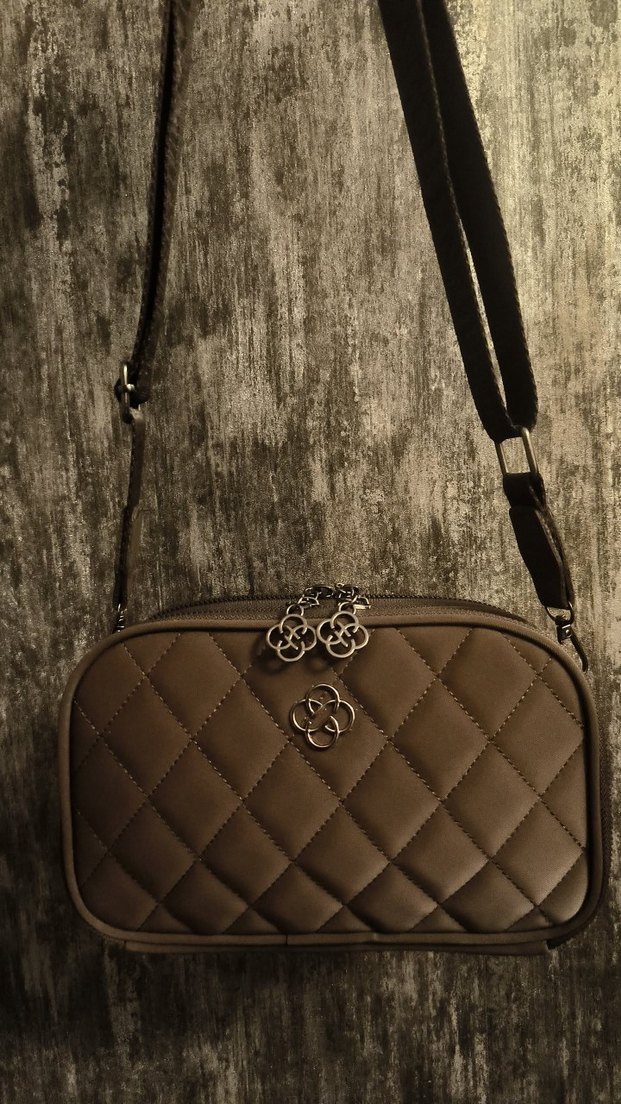 Kahverengi deri, kapitone işlemeli ve tokalı detaylara sahip kadın çantası, günlük kullanım için çağdaş Paris tarzında.