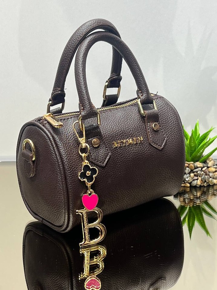 Kahverengi deri kadın çanta, tokalı saplar ve renkli baskılı aksesuar ile günlük sokak stiline uygun.