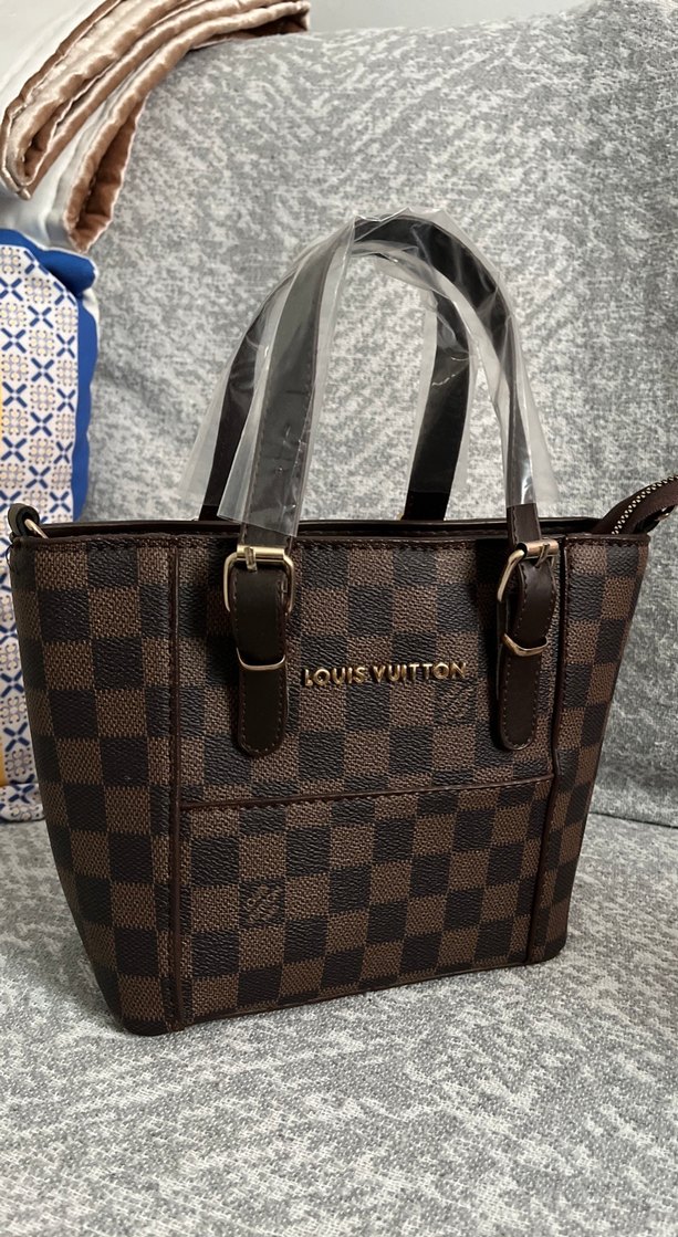 Bu modern klasik kahverengi deri kadın çantası, kare desenli baskıya ve tokalı tasarıma sahiptir. Önünde 'LOUISYUITTO' yazısı bulunur, günlük kullanım için uygundur.