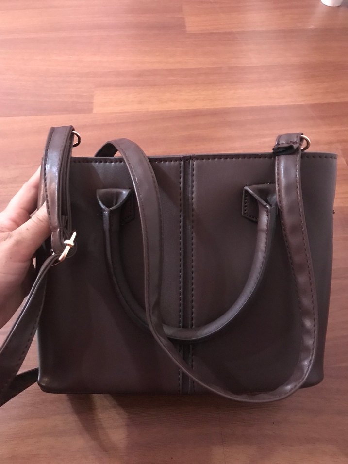 Kahverengi deri, minimal ve çağdaş tasarıma sahip kadın çanta. Tokalı askısı ve desensiz yüzeyi ile günlük kullanıma uygundur.