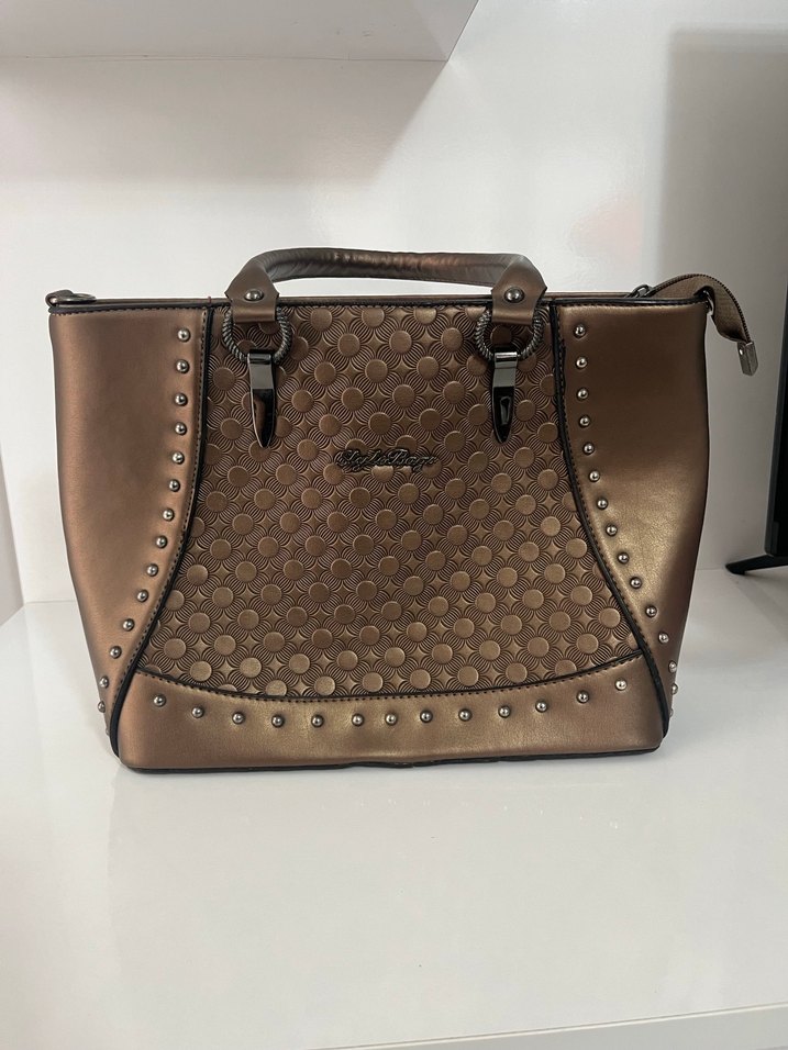 Kahverengi parlak deri çanta, tokalı saplar ve çivili detaylarla. Günlük kullanıma uygun, sokak stilini yansıtan modern desenli kadın çantası.