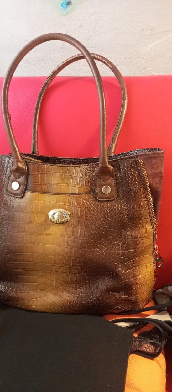 crocy yılan derisi desenli, kahverengi deri kadın çanta. Tokalı ve uzun saplı, günlük kullanıma uygun çağdaş tarzda.