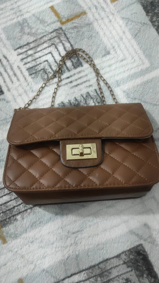 Parlak kahverengi deri, tokalı, zincir saplı, modern klasik görünümlü kapitone desenli kadın çanta.