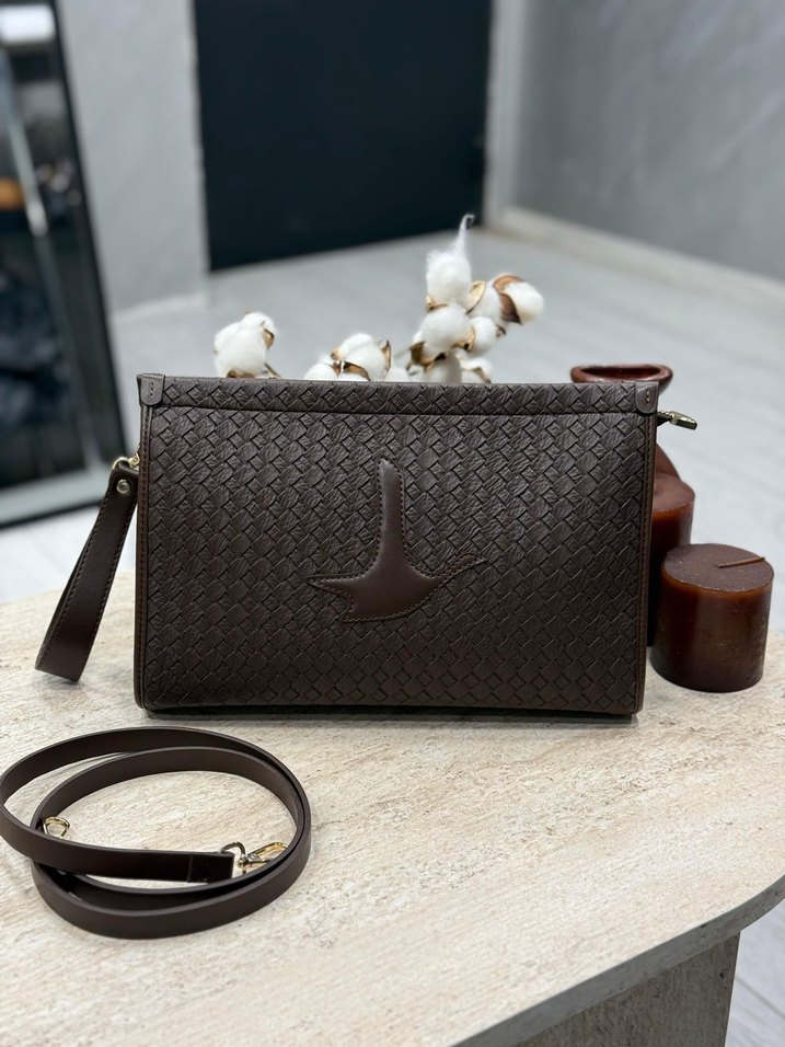 Kahverengi deri, kemerli ve dokulu tasarıma sahip kadın çantası. Klasik zarafeti yansıtan modern stil, çıkarılabilir askı ile günlük kullanıma uygun.