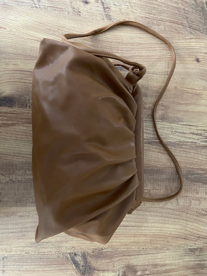 Parlak kahverengi deri kadın çanta, kemerli detaylı ve minimalist sade tasarıma sahiptir. Sokak stiline ve günlük kullanıma uygundur, desen yoktur.