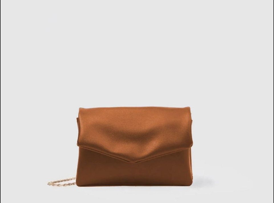Parlak kahverengi deri kadın çanta, kemerli detaya sahip, minimalist ve çağdaş tasarım. Günlük kullanım için uygun.