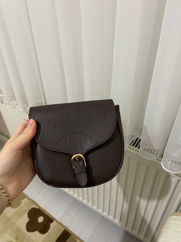 Kahverengi deri, tokalı kapaklı kadın çanta, modern klasik tarzda ve günlük kullanıma uygun.