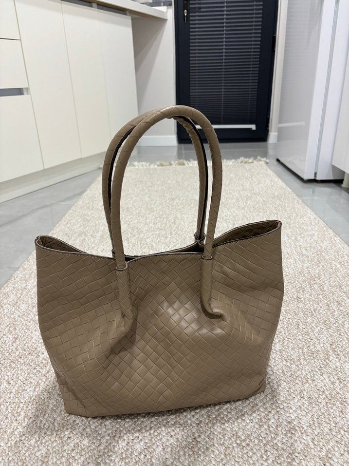 Kahverengi deri kadına özel, tokalı askılı ve örme desenli çanta. Günlük kullanıma uygun, çağdaş Paris tarzında.