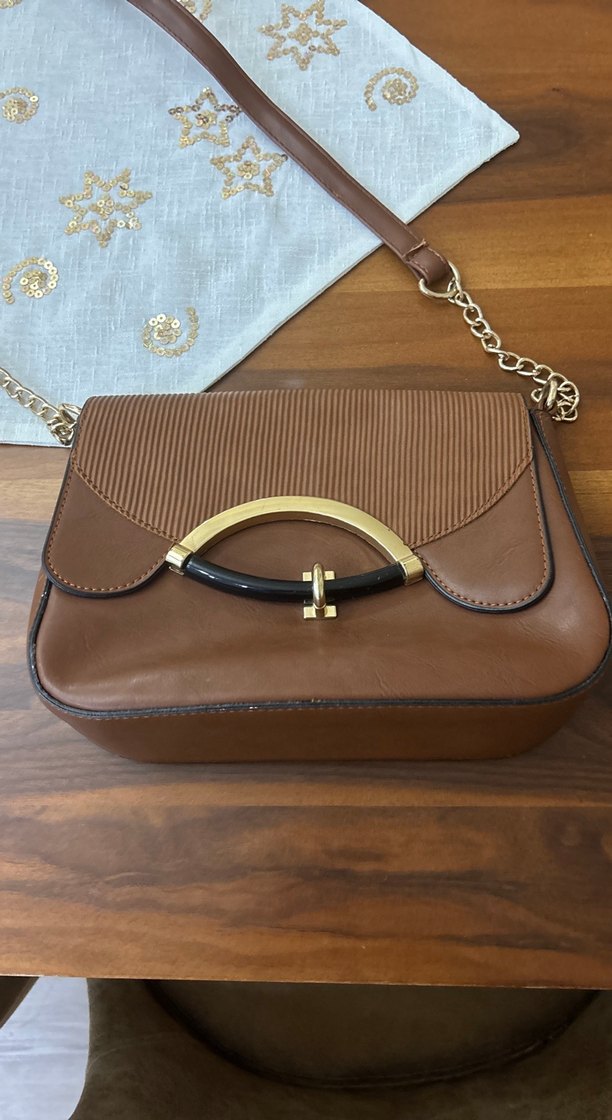 Parlak kahverengi deriden yapılmış, tokalı ve zincir askılı kadın çantası. Klasik zarafeti modern dokunuşla birleştirir.