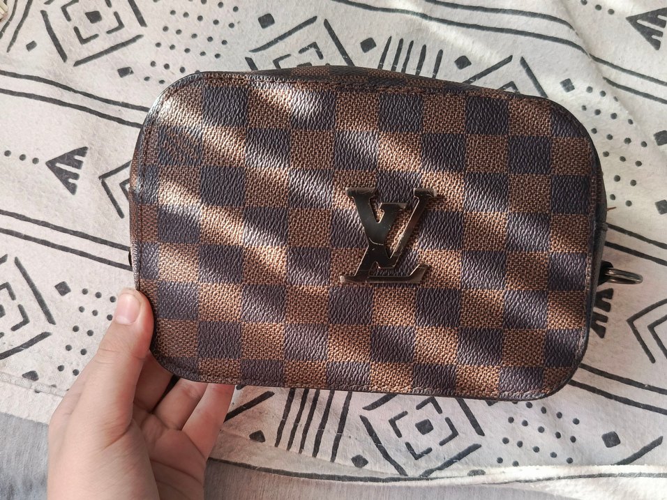 Kahverengi deri, parlak kareli baskılı ve tokalı detaylı kadın çantası. Paris tarzı ve günlük kullanım için uygun, sokak modasına uygun.