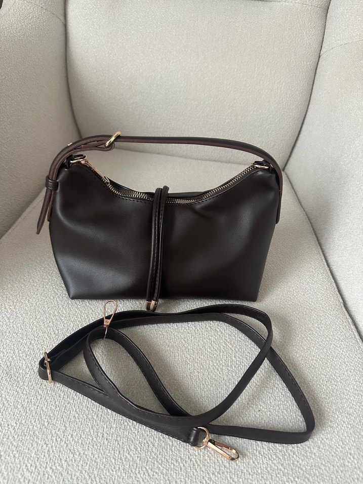 Koyu kahverengi deri kadın çanta, minimalist stil ve kemer detayına sahip, çıkarılabilir askısı ile günlük kullanım için uygundur. Zara muadilidir