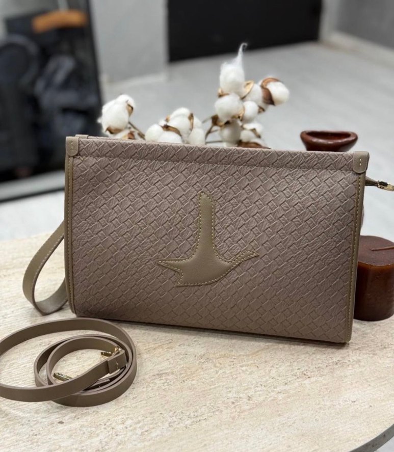 Kahverengi deri, desenli ve kemerli tasarıma sahip kadın çantası, modern klasik ve Paris tarzını birleştirir.