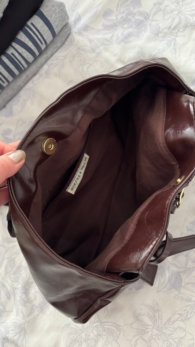 Koyu kahverengi deri, tokalı, desensiz kadın çantası. Günlük kullanım için uygun, bohem ve klasik zarafet tarzını yansıtır. Kızl kahve diye de geçiyor olabilir