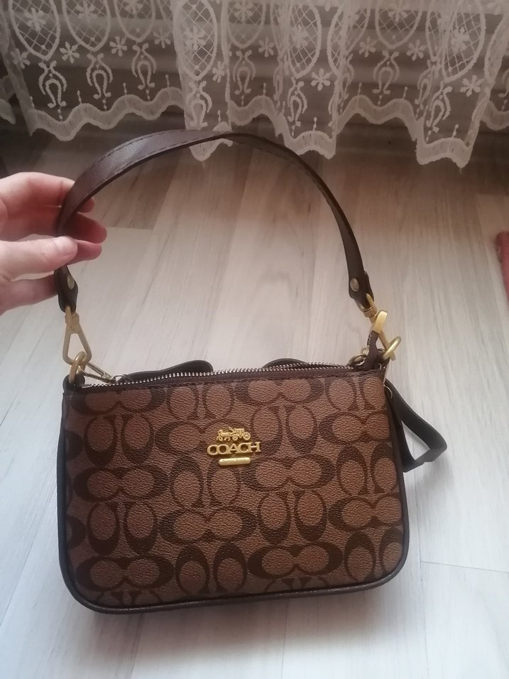Kahverengi deri kadın çanta, parlak baskılı desenli ve tokalı askılıdır. Klasik zarafeti modern klasik tarzla birleştirir, günlük kullanıma uygundur. Fermuarlı ve altın rengi detaylıdır. Orjinal değildir ithaldir