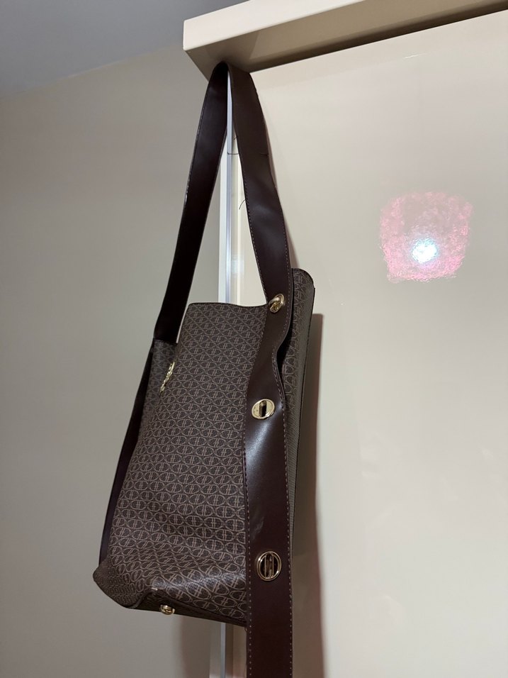 Kahverengi deri ve baskılı desenli, tokalı detaylara sahip kadın çantası. Günlük kullanıma uygun, klasik ve minimalist tarzda.