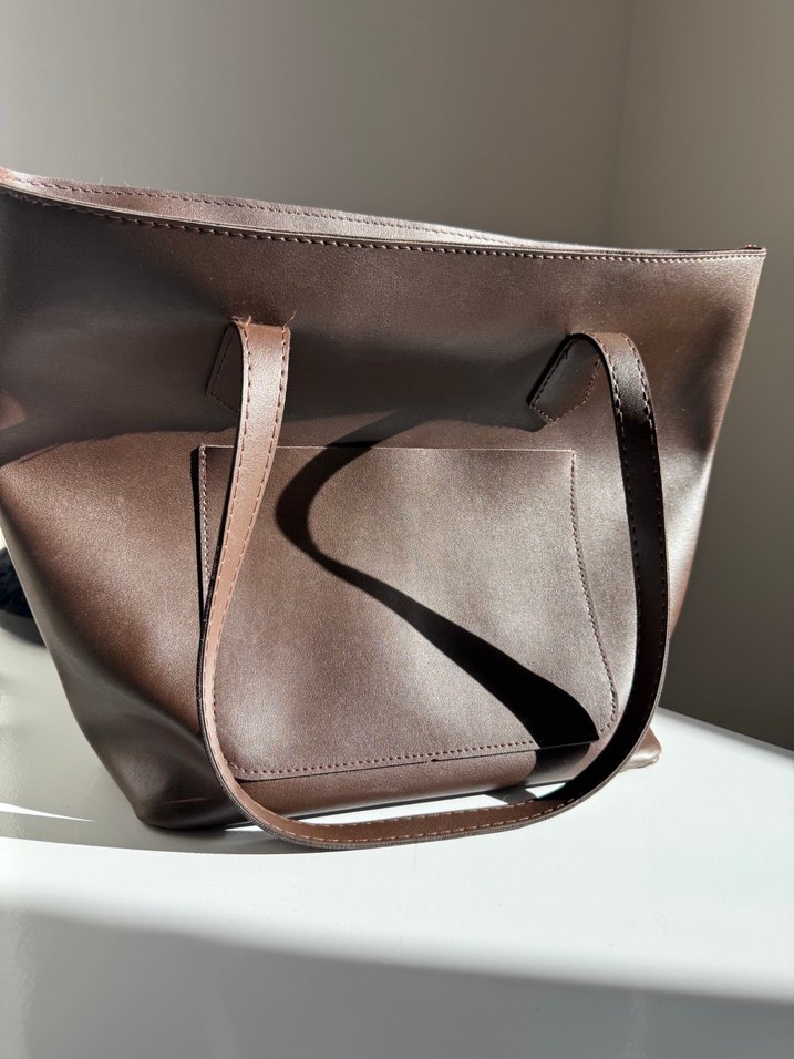 Koyu kahverengi deri kadın çanta, az kullanılmış fermuar bölümünde küçük bir yırtığı var