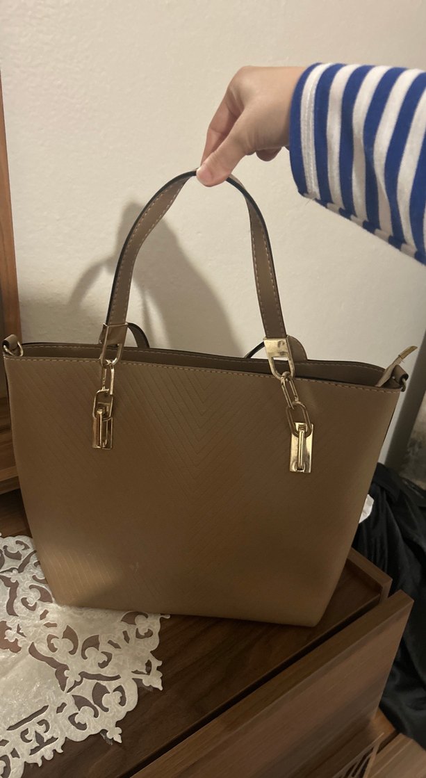 Kahverengi deri, tokalı askılı kadın çanta, modern klasik tasarıma sahip, günlük iş kullanımı için uygun.