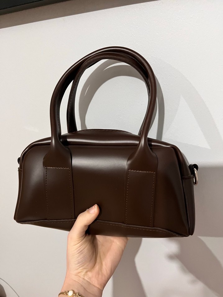 Koyu kahverengi deri kadın çanta, minimalist ve desensiz tasarıma sahiptir. Çift saplı, günlük kullanım için uygun, rahat şıklık sunar.