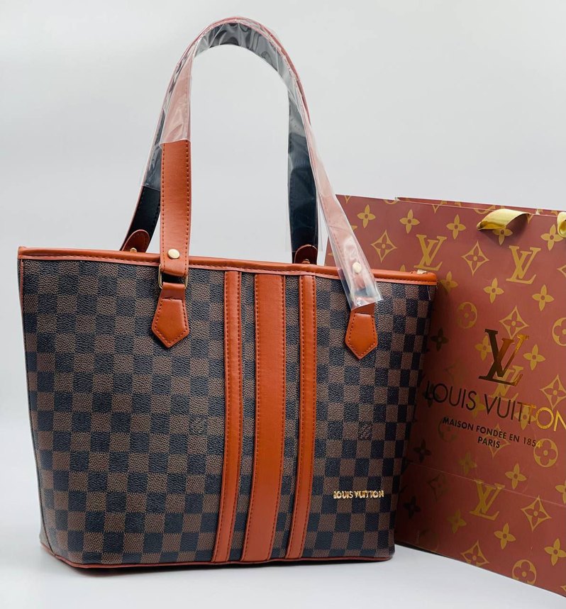 Kahverengi deri, parlak baskılı desenli ve tokalı askılı kadın çantası. Günlük kullanım için modern klasik tarzda.