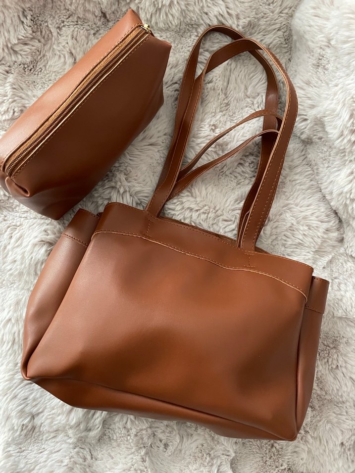 Parlak kahverengi deri kadın çanta seti, geniş omuz çantası ve küçük cüzdan ile minimal ve çağdaş bir stil sunar, günlük kullanıma uygundur.