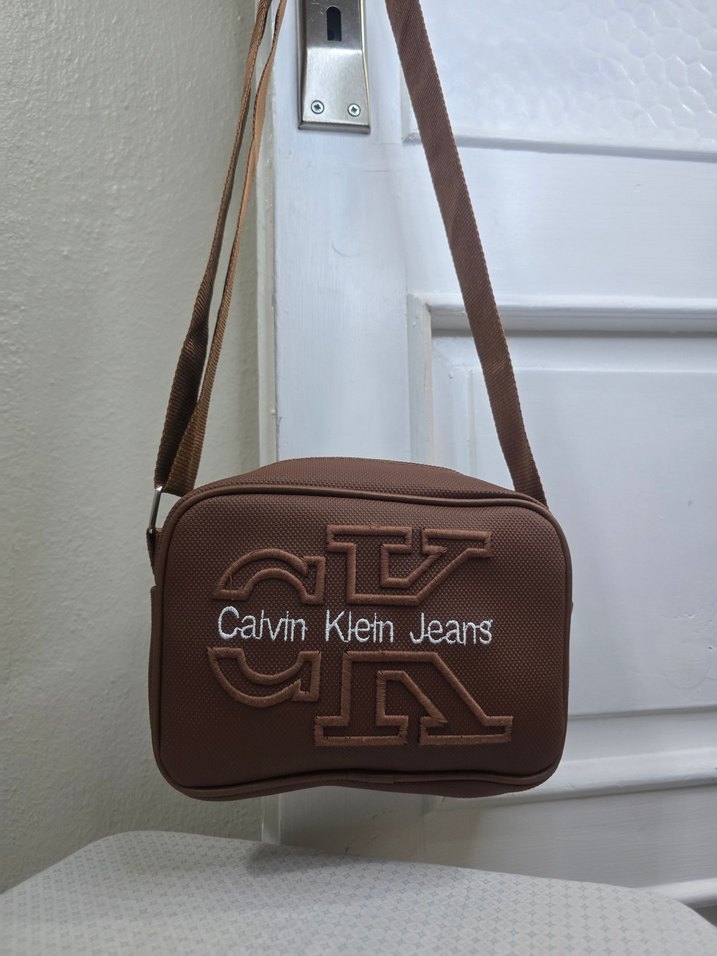 Kahverengi deri çapraz çanta, baskılı Calvin Klein Jeans logosu ve tokalı askısı ile sokak stiline uygun.