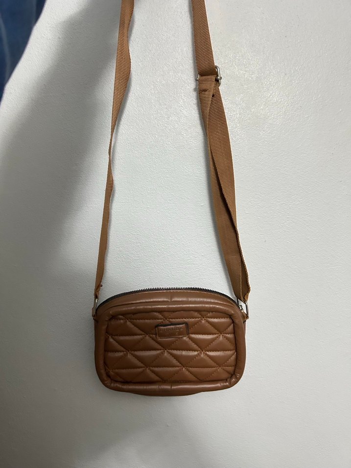 Açık kahverengi deri çapraz çanta, kemerli tasarıma sahip, günlük sokak modasına uygun. Minimalist ve desensiz tarzıyla her gün kullanılabilir.