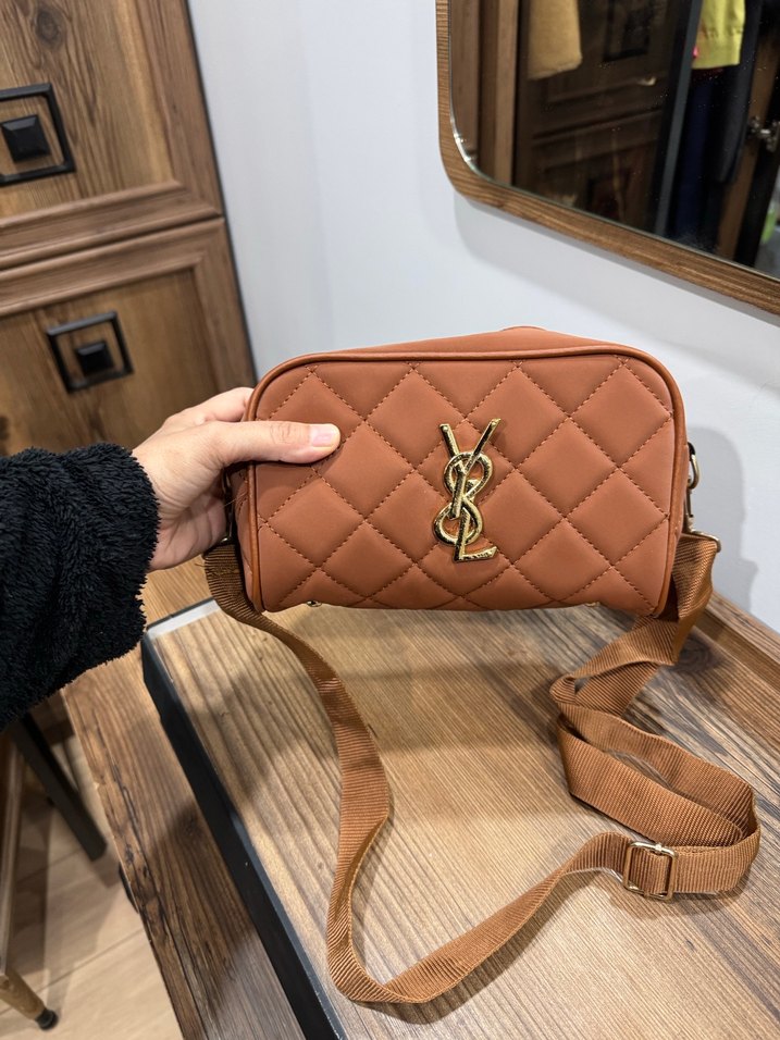 Kahverengi deri, parlak ve desenli kadın çapraz çanta. Tokalı askısı ile trend sokak stiline uygundur.