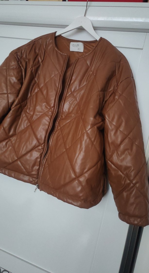 Kahverengi deri ceket, bol kesim, yuvarlak yaka ve kayışlı kollara sahiptir. Kemer detaylı, kapitone desende, midi boy ve günlük kullanım için rahat bir modeldir.