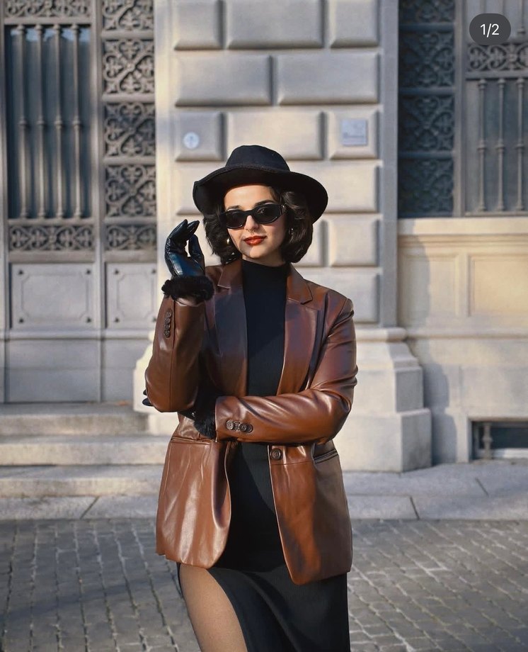Kahverengi deri kadın ceket. İnce kesimi ve kayışlı kollarıyla günlük kullanıma uygun.