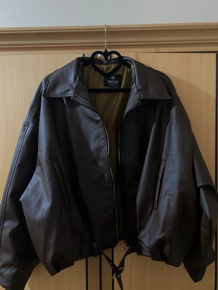 Kahverengi deri ceket, geniş kesim, yakalı ve kemerli bel detayıyla dikkat çeker. Askılı kollu, midi boyda, günlük ve sokak stili için uygundur.
