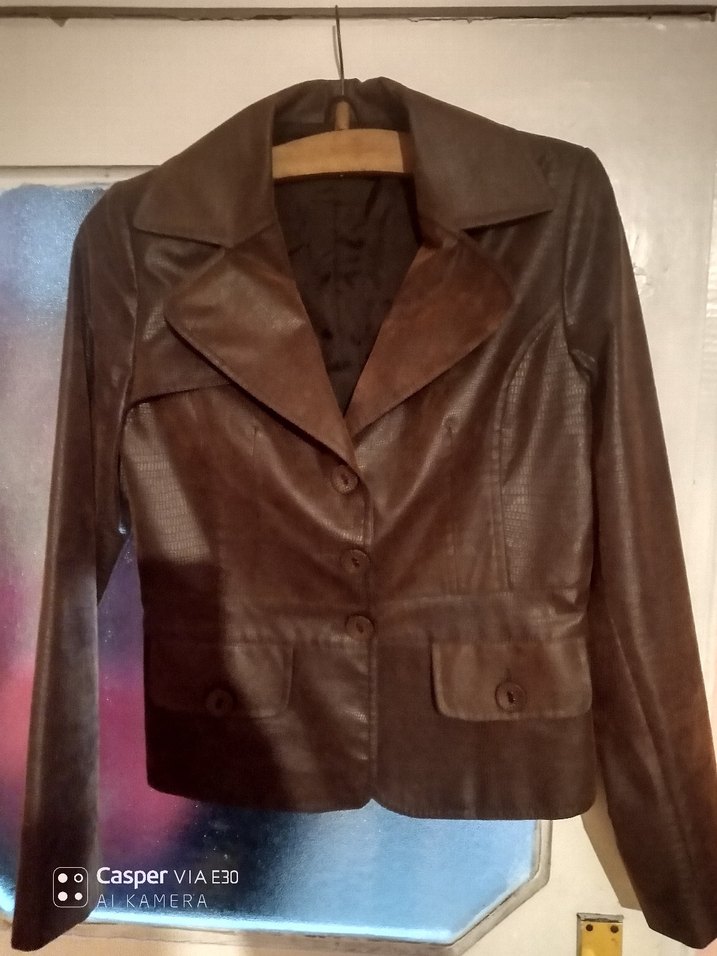 Kahverengi deri kadın ceketi, kesik yakalı ve düğmeli önlüdür. Regular fit, uzun kollu ve biker tarzındadır, ofis kullanımı için uygundur. Midi boyda ve desensizdir. hakiki degil cok kaliteli