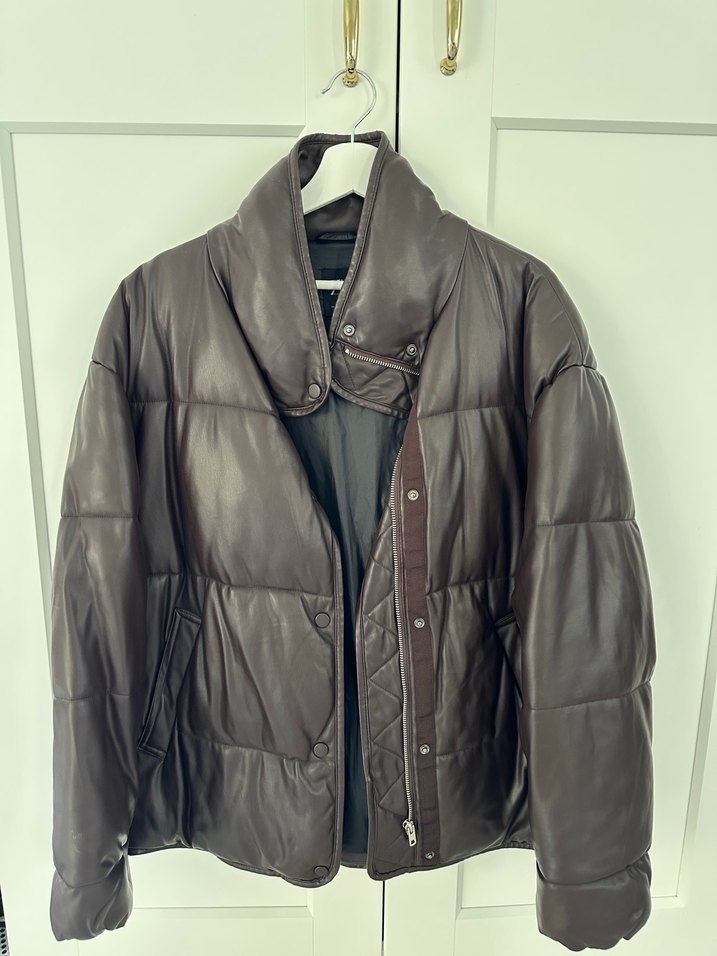 Kahverengi deri kadın ceket, yüksek yakalı ve kemerli, bol kesim ve askılı kollu. Midi boy, desensiz ve günlük kullanıma uygun.