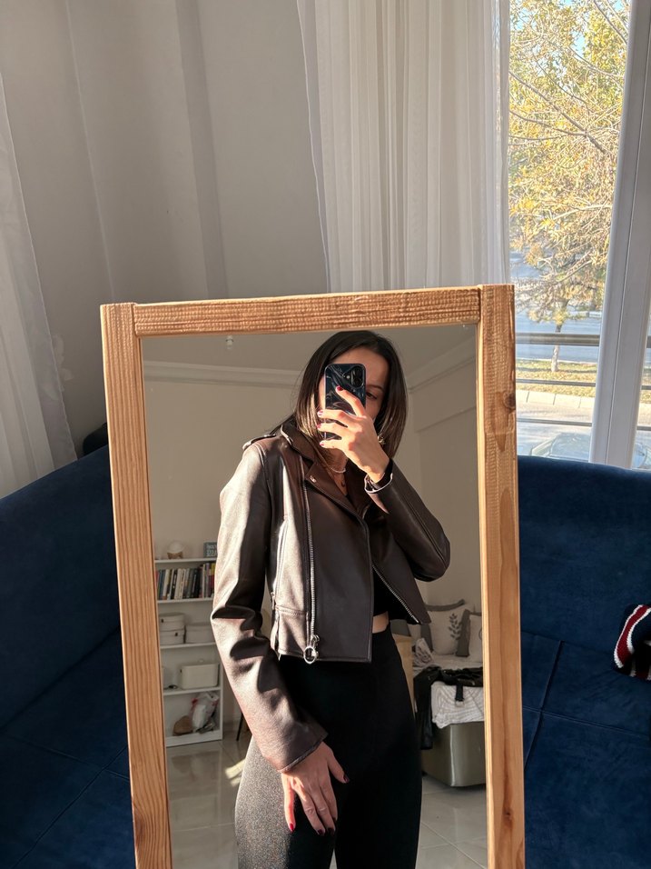 Kahverengi deri, yüksek yakalı ve uzun kollu, normal boyda, vücuda oturan kadın ceket. Günlük kullanıma uygun, şık ve rahat bir stil sunar.
